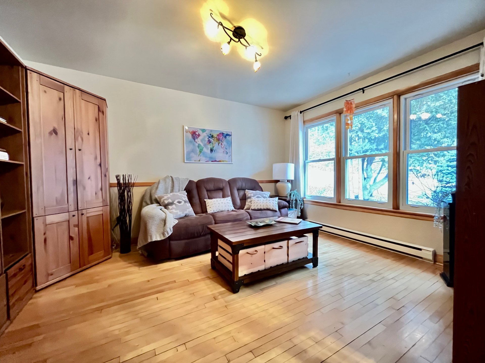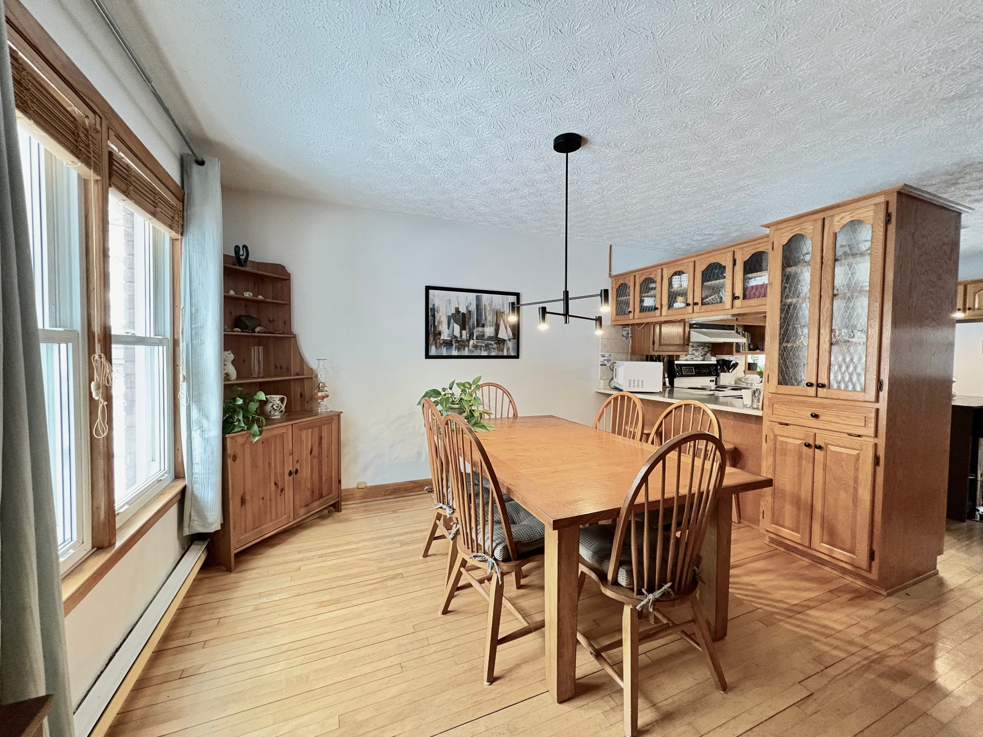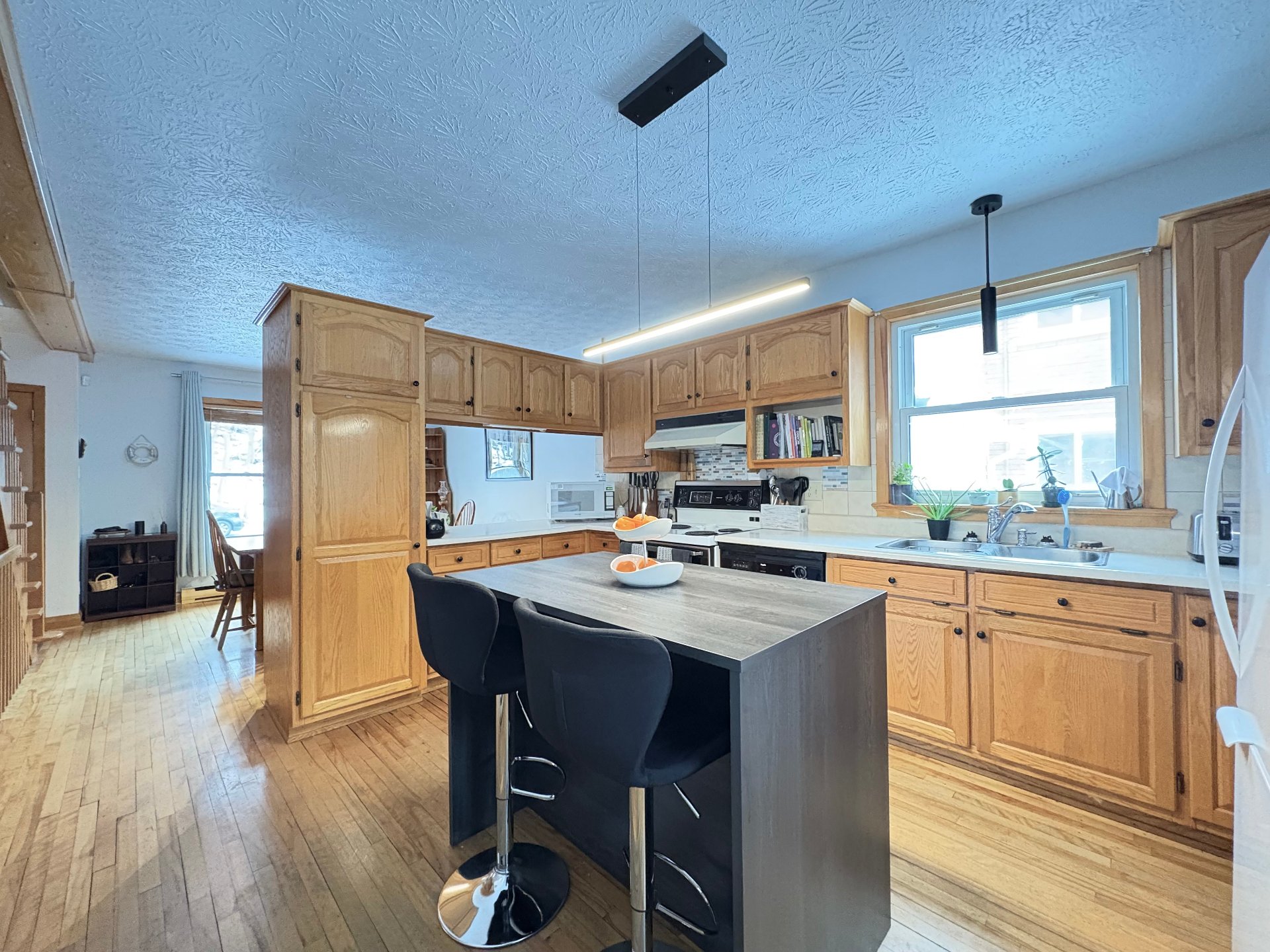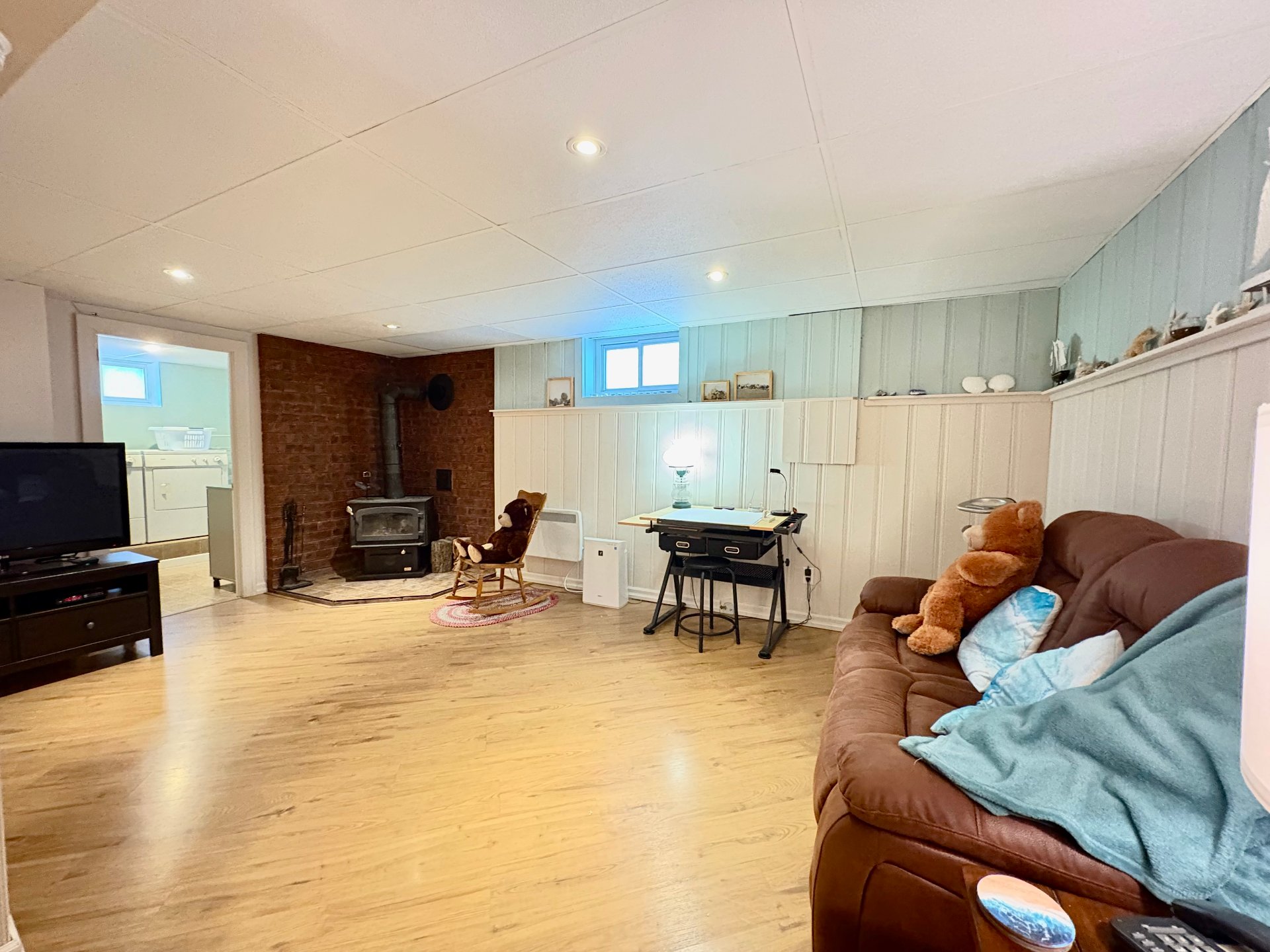string(187) "Lustres, stores, lave-vaisselle, îlot et 4 bancs de comptoir, tablettes décoratives, 2 commodes dans salle de lavage, thermostats électroniques, balance du bois de chauffage, cabanon. "