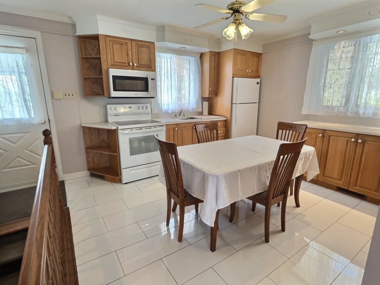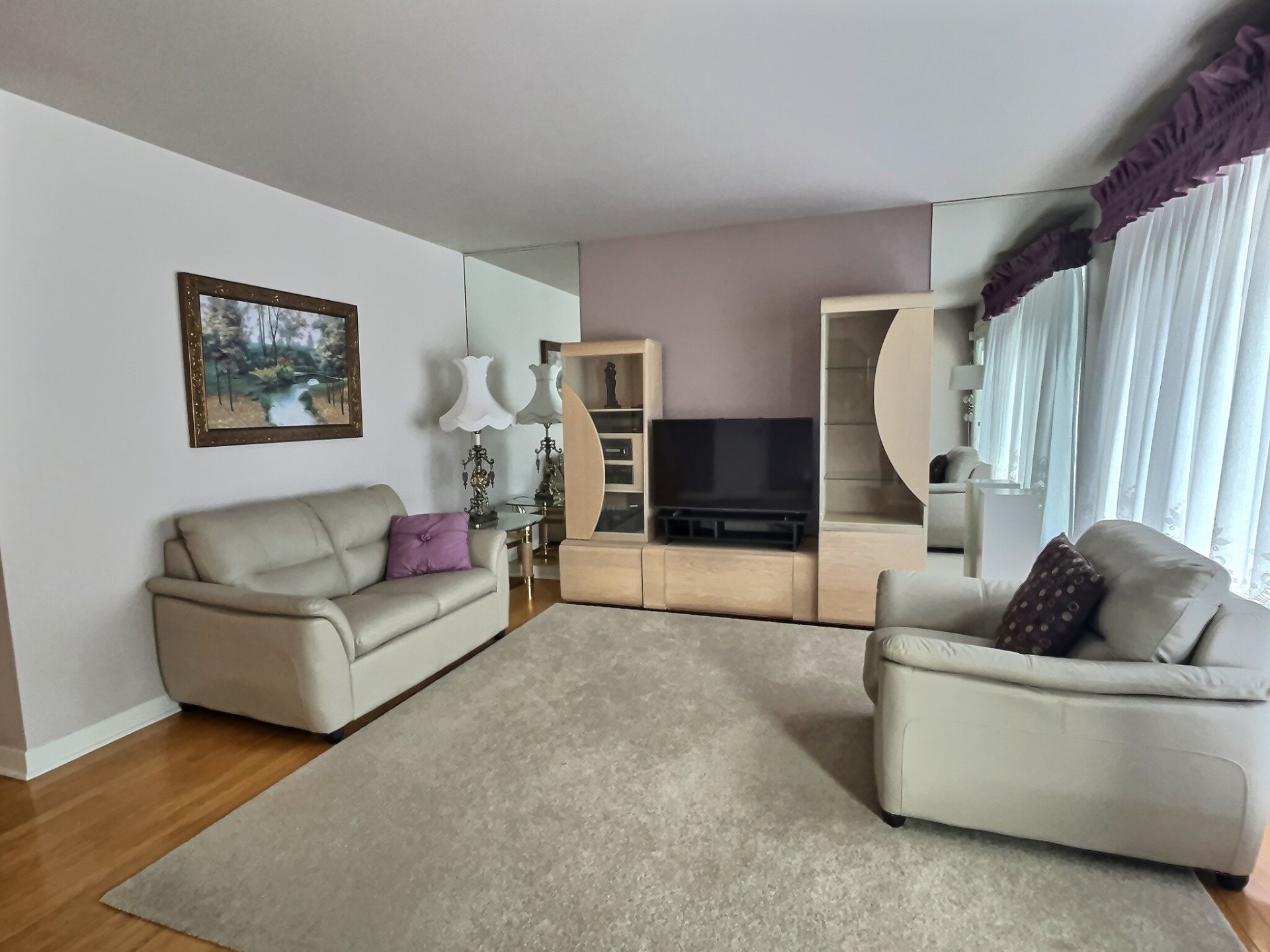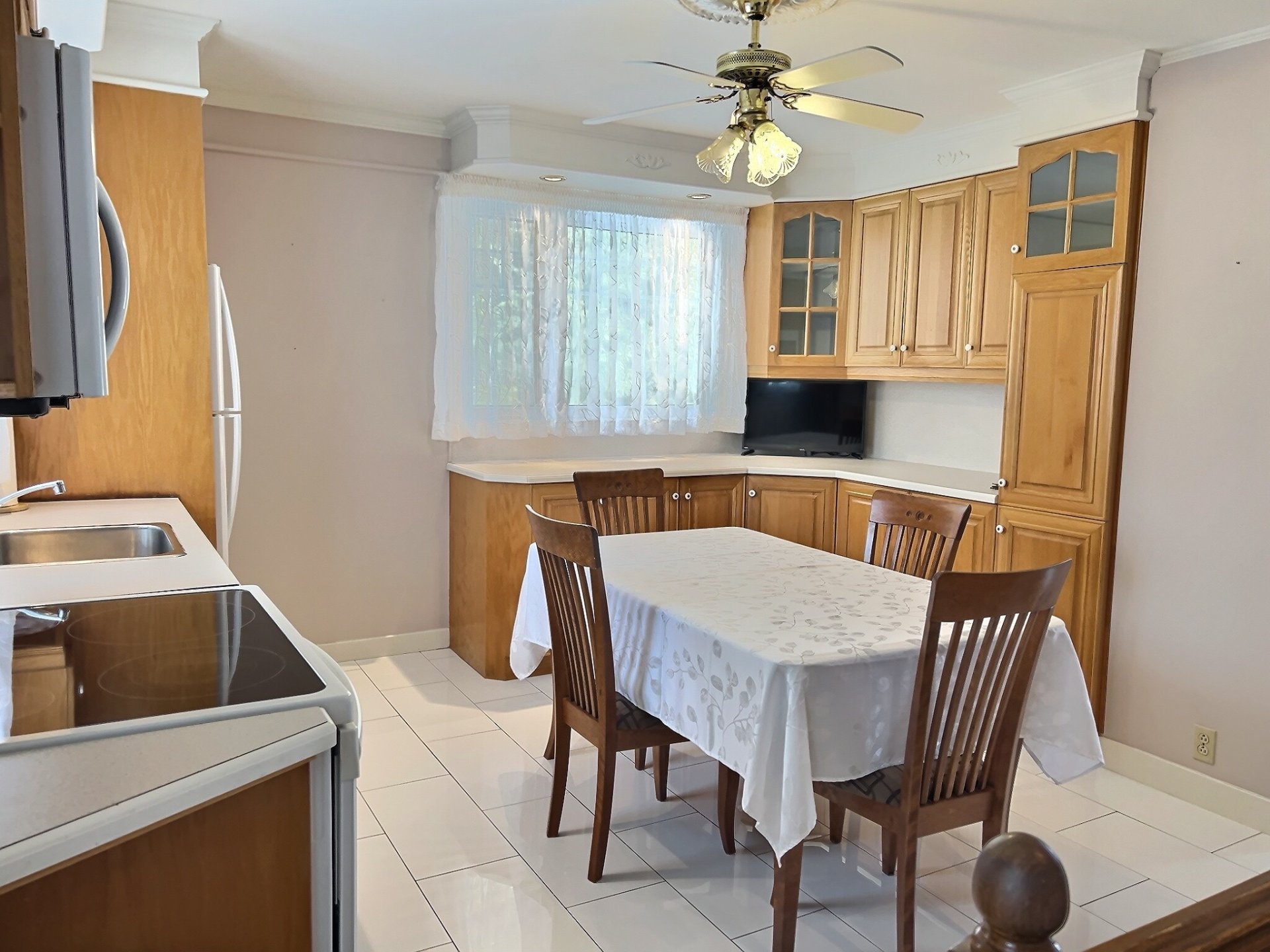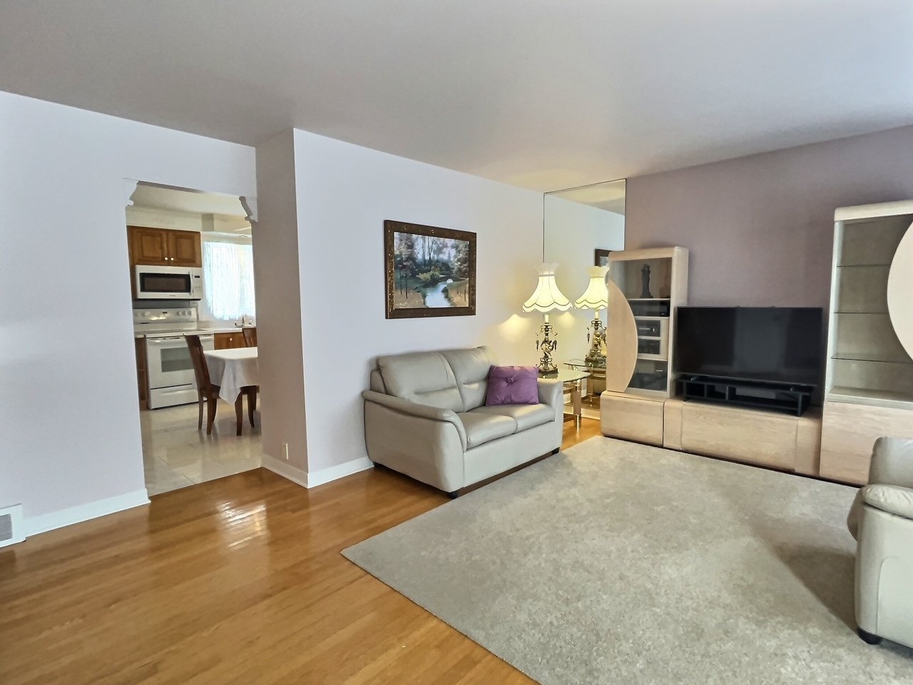 poêle, réfrigérateur, laveuse-sécheuse, 1 table de cuisine et 4 chaises, meuble TV et téléviseur, 1 table de salon, 1 fauteuil, 1 causeuse, 2 lampes.